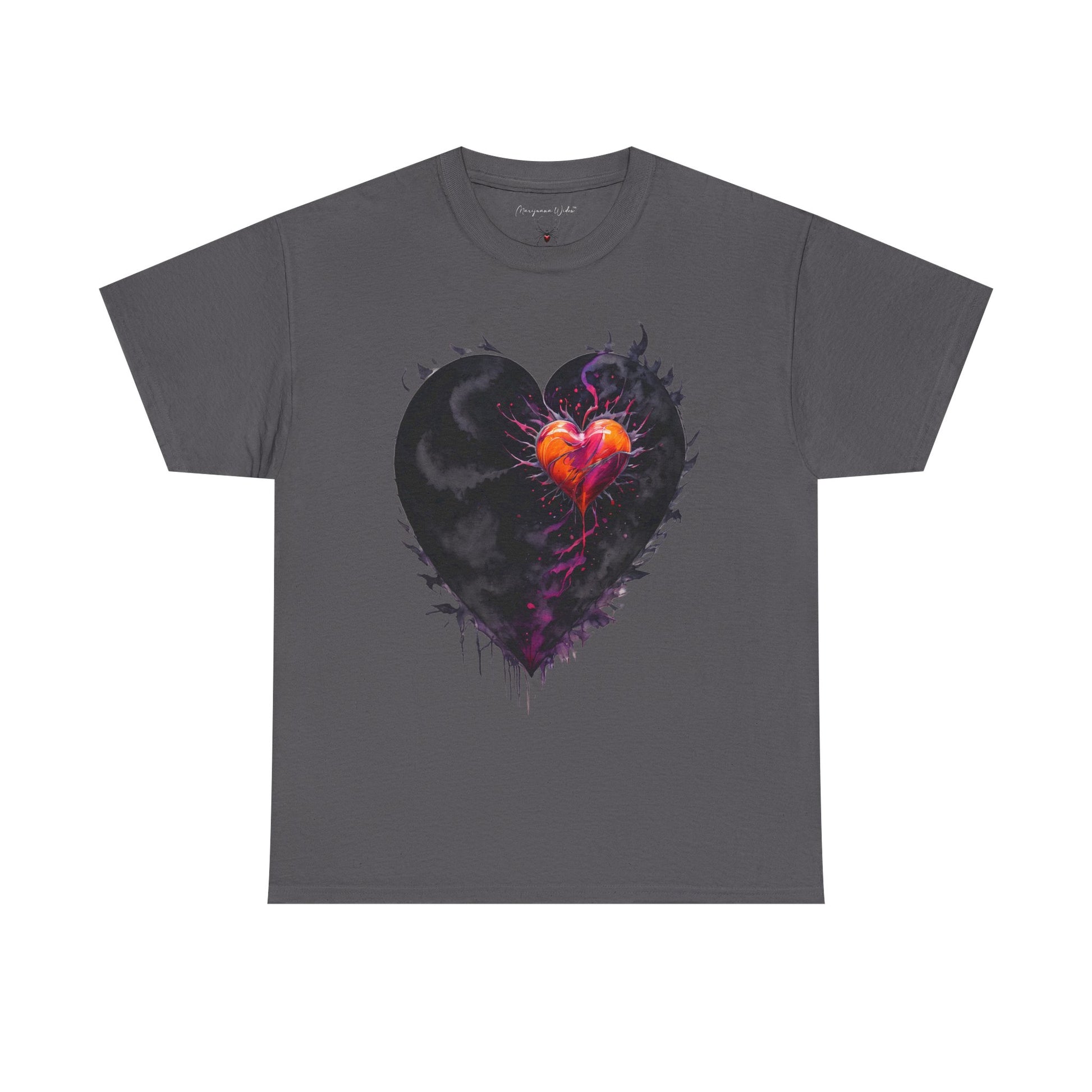 A bold, expressive tee with an emotional edge — a charcoal-black heart cracked open to reveal a molten core of vivid orange and magenta. The artwork reads like a moment of transformation: shadow and flame, rough edges and dripping texture, all printed with crisp DTF/DTG detail that holds up wash after wash. Wear it when you want your outfit to speak: for late-night shows, art meetups, or those nights you’re stirring up change. The relaxed, classic fit and soft yet sturdy cotton give it everyday comfort while the tubular knit and ribbed collar keep the silhouette neat. It sits comfortably alongside layered looks — under a leather jacket or with a flannel tied at the waist — and shows up loud and clear on the chest where the heart takes center stage.